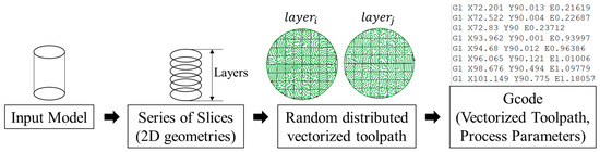 Compared with these structures, our proposed in-plane isotropy toolpath can achieve a solid component in a more flexible filament arrangement to reduce the in-plane void region and increase mechanical strength at the same time. Recently, several researchers [20,21] studied the rotational angle per layer to improve the mechanical properties; however, the rotational angle can create voids on the 2D geometry based on the deposited filament shape, which can further induce the unsatisfactory mechanical properties. The non-planar toolpath [11,22] effect towards improving mechanical strength is still ambiguous; the non-planar layer creation and modeling towards better print performance are not developed. In this research, an isotropy in-plane material deposition strategy is provided to fulfill the solid density with strong interfacial bonding. Our developed toolpath strategy is targeting to achieve a randomized material distribution in one layer while maintaining the material deposition in a continuous manner. The proposed toolpath generation workflow is presented in Figure 3.