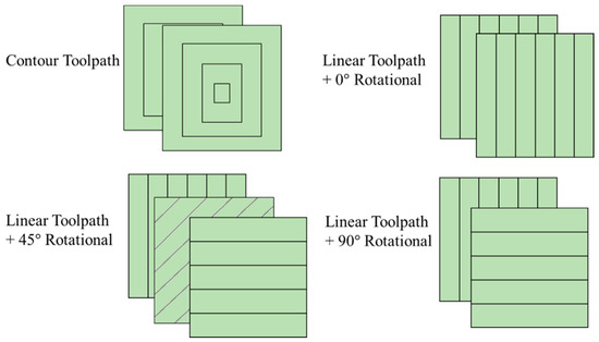 Besides the effect from process parameters and working environments, the leading causes of insufficient strength are low infill density, weak interfacial bonding, and in-plane anisotropy of the material [9,10]. These physical phenomena are significantly influenced by the toolpath strategy and can be optimized by altering manufacturing strategy to achieve a desired mechanical strength. Studies reveal that higher density can lead to a stronger component; thus, a 100% solid infill is desired in our research to enhance the mechanical strength. In order to achieve a 100% density infill, two major toolpaths are commonly used in today’s FFF process—the linear and contour toolpath [11]. Other existing toolpaths, such as honeycomb, triangle, cubic, and Gyroid [12], are hard to achieve a solid infill for any given geometry. All of the above-mentioned toolpath strategies can fulfill 100% infill. However, the homogeneously laminated filament bars can cause the in-plane anisotropy material property [13].