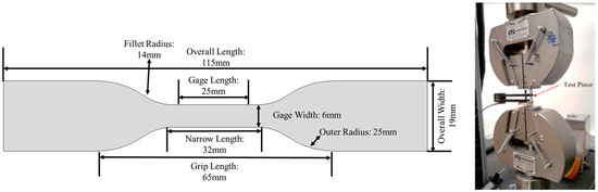 Test specimen (ASTM D638 IV) and test setup for tensile stress.