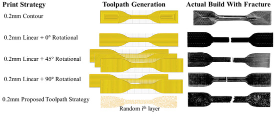 Table 3 and Figure 10 show that the specimens printed with contour toolpath strategy at 0.1 mm and 0.2 mm show a better tensile strength and a higher density component compared with other specimens printed with the traditional linear toolpath even with a rotational angle. However, the specimen with the proposed toolpath that is printed with a 0.1-mm layer thickness behaves a 19.49% larger tensile strength than the 0.1-mm layer thickness specimen with a contour toolpath. The tensile test of the specimen with the proposed toolpath that is printed at a 0.2-mm layer thickness performs similarly.