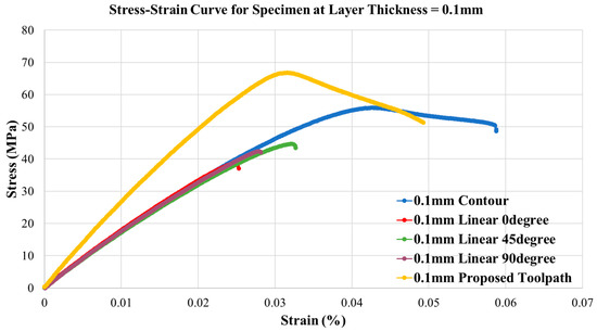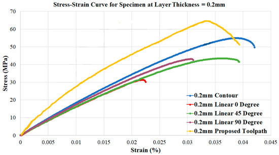 Figure 8 and Figure 9 indicate the proposed toolpath strategy can successfully increase the tensile strength compared with the same layer thickness specimens. The ultimate tensile strength can be improved by at least 19% compared to the traditional contour toolpath. In the meantime, the proposed toolpath would lead to a minimum extension before the fracture.