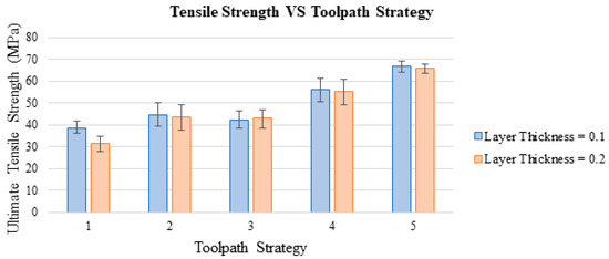 Figure 10 presents all print specimens with each printing strategy with their average ultimate tensile strengths and associated standard error bars. From this figure, we can see that the 0.1-mm layer thickness can strengthen the part of the 0.2-mm layer thickness. However, such layer thickness effect is not significant on the printed specimens using the proposed toolpath. This further proves the proposed toolpath can create a stronger tensile property, disregards the layer thickness.