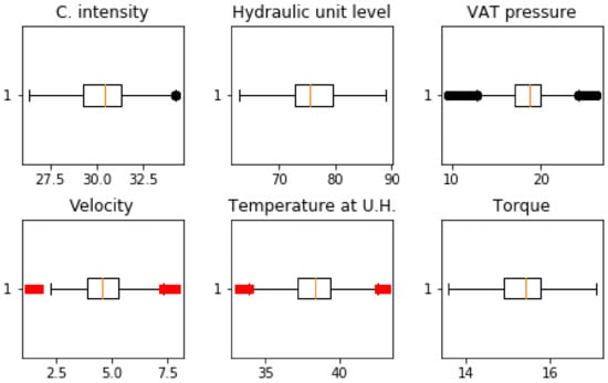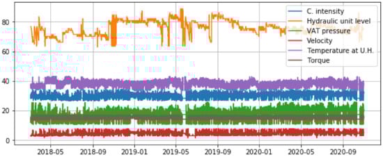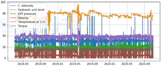 Plot of the dataset values after cleaning discrepant data. The variables are current intensity, hydraulic unit oil level, VAT pressure, velocity, temperature, and torque.