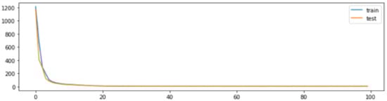 To train and test the models, the dataset was divided into train and test subsets. Validation was performed using the test set, but those samples were not incorporated into the training set. The training set contained 85% of the samples and the test set the remaining 15% of samples. These values are adequate for convergence during learning. As an example, Figure 6 shows a learning curve for a model with 70 units in the middle layer and a window of 30 lag samples. The figure shows that learning converges and takes fewer than 10 epochs. The remainder experiments were performed using 100 epochs.