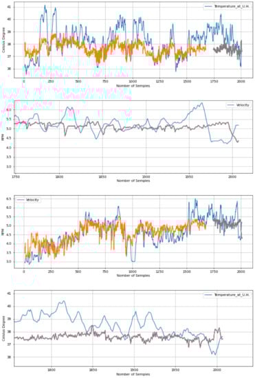 Figure 9 shows plots of the results obtained using the model using 40 units in the hidden layer and a 10-day window of samples. As the figure shows, the forecasts in general follow the actual signals most of the time. However, there are still some areas where the actual signal diverges a small percentage from the prediction, namely for velocity and temperature. Most of the differences may be due to behaviors that are still difficult to capture due to the small dimension of the dataset. As more data will be collected, the neural models will probably be able to capture more patterns and offer more accurate predictions.