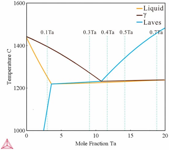 Figure 1 shows the pseudo-binary diagram of CrCoNi-Ta calculated by the Thermo-Calc software (ThermoCalc, Stockholm, Sweden) based on Ni-based database TTNi7 (ThermoTech Ltd., Surrey, UK). It shows that the primary phase is γ for a hypoeutectic composition, the primary phase is the C14 Laves phase for a hypereutectic composition. The eutectic point of the EMEA alloy falls approximately at Ta-11% and CrCoNiTa0.4, which is in general agreement with the previously discussed viewpoints. So, we designed the CrCoNiTax (x = 0.1, 0.3, 0.4, 0.5, 0.7) alloys, chemical compositions are hypo-eutectic point (0.1), around eutectic point (0.3, 0.4, 0.5) and hyper-eutectic point (0.7), respectively. For convenience, the alloys were named by Ta0.1, Ta0.3, Ta0.4, Ta0.5, Ta0.7, respectively.