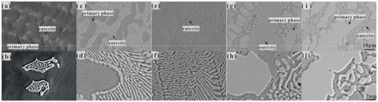 SEM images of CrCoNiTax under as-cast microstructure; (a,b) = 0.1; (c,d) x = 0.3; (e,f) x = 0.4; (g,h) x = 0.5, (i,j) x = 0.7. Primary phase and eutectic under different compositions are marked.