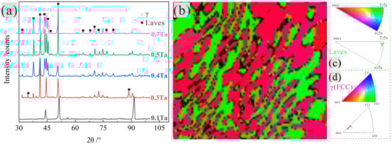 We used XRD to further confirm the crystal structure. The XRD patterns of as-cast CrCoNiTax alloys are presented in Figure 3a. With the increasing Ta addition, more diffraction peaks of Laves phase are observed in the Ta0.3, Ta0.4, Ta0.5, Ta0.7 alloys. The crystal structure of Laves phase is identified as C14 HCP with the lattice constant of a = b = 0.4797 nm and c = 0.7827 nm [23,24].