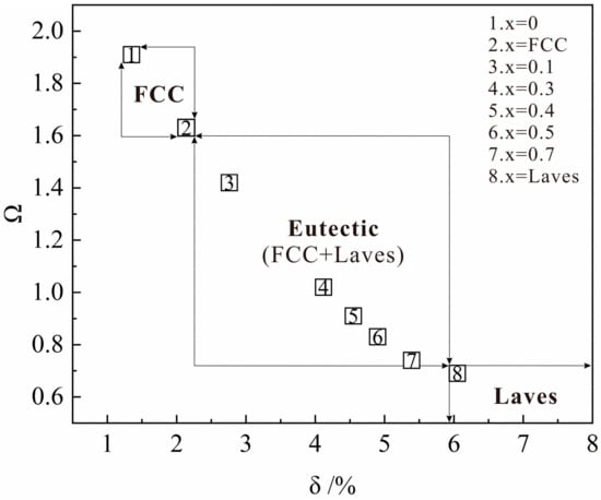 Relationship between Ω and atomic size difference δ indicating the evolution of FCC, eutectic, and Laves regions.