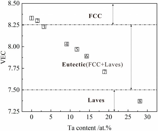 It has been found that FCC phase is stable with VEC 8 and BCC phase is stable with VEC 6.87 [27]. CoCrMnFeNi (VEC = 8.27), CoCrFeNi (VEC = 8.25) and CrCoNi (VEC = 8.33) [13,28,29]. As for BCC phase, MoNbTaVW (VEC = 5.4) and MoNbTaW (VEC = 5.5) at VEC 6.87 [30]. Thus, VEC is a parameter that can effectively predict phase formation. Figure 5 illustrates that CrCoNi and x = FCC single-phase locate at VEC 8.25, while two phases (FCC + Laves) exist in the range of 7.5 VEC 8.25, and Laves phase (x = Laves) lies at VEC 7.5.