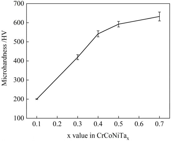 The load of 1000 g for hardness measurement has been selected to obtain the composite hardness. Figure 6 shows the variation of hardness with Ta content in the CrCoNiTax alloys, the hardest alloys is 632HIV when the x value reaches 0.7. According to the previous results, the increasing Ta addition causes the increasing volume fraction of Laves phase. The Laves phase in alloy is a hard and brittle phase of HCP structure, therefore with bigger volume fraction of Laves phase, comes higher hardness.