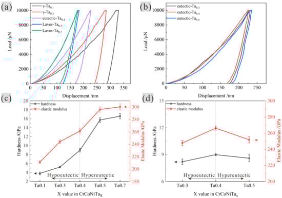 Typical load-displacement curves (a), hardness and elastic modulus (c) of primary phase in Ta0.1, Ta0.3, Τa0.4, Ta0.5 and Ta0.7, typical load-displacement curves (b), hardness and elastic modulus (d) of eutectic in Ta0.3, Ta0.4 and Ta0.5.