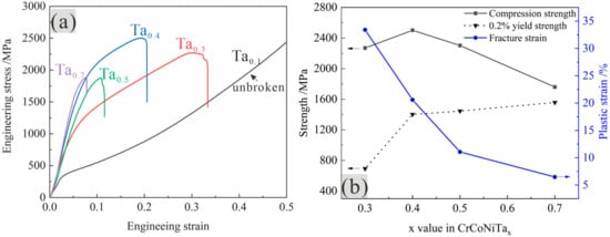(a) Compression engineering stress-strain curves; (b) compression strength, 0.2% yield strength and fracture strain of CrCoNiTax alloys.