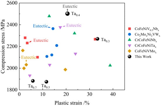 Figure 9 shows the mechanical properties of HEA with a typical eutectic structure and compares them with the results of this work, (CoFeNiV0.5Nbx [30], Co2MoxNi2VWx [32], CrCoFeNiNbx [11], CoCrFeNiTax [12], CoFeNiVMox [33]), alloys with full eutectic microstructure are described as “eutectic”. Compared with other alloys, EMEA CrCoNiTa0.4 possesses relatively good compression strength (2502MPa) and good plastic strain (20.6%) compared with EMEA CoCrFeNiTax (compression strength 2377 MPa, plastic strain 17.5%).