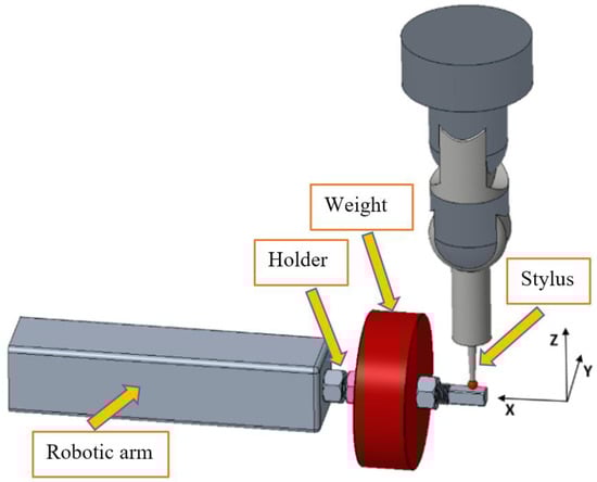 The contact measuring method (CoM) on a 3D-measuring machine can be implemented by a stylus with a ruby ball manually or by programming the stylus for repeated measurements. In our case, stylus programming by the learning method was used. Prior to measurement itself, the coordinate system of the 3D-measuring machine and the coordinate system of the measured-scanned body were identified. An NC (numeric control) scanning program was created in the control system of the 3D-measuring machine RAPID THOME Präzision [24], which ensured scanning of positions during repeated measurements. Stylus with a 4 mm diameter ruby ball was used for scanning as in Figure 4. The defined scanning sensitivity of the 3D-measuring machine 0.001 mm was achieved by observing the design and operating conditions. A holder was mounted on the robotic arm, which allowed mounting and weight exchange, and at the same time a part of it was machined so that reading of three perpendicular planes is possible, which after alignment with the reference coordinate system 3D-measuring machine were used to sense the position.