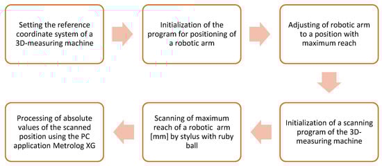The measuring chain for CoM is shown in Figure 5. After setting the reference coordinate system of 3D-measuring machine (it consists in setting a fixed zero point on the base frame from which all measured values are read), the program for positioning the robotic arm is initialized and then adjusted to the position with maximum reach. The 3D measuring machine is then initialized. The stylus with ruby ball automatically senses the end position of the robotic arm [mm] and loads it into the PC application Metrolog XG. In this application, the end position of the robotic arm is evaluated.