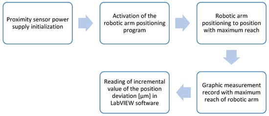 In the measuring chain (Figure 7), the power supply to the proximity sensor is initialized first. Subsequently, the program for positioning the robotic arm is activated. This is followed by positioning the robotic arm to the position with maximum reach. After reaching this position, a graphical recording of the maximum reach of robotic arm measurement will be performed. The incremental value of position deviation for the maximum reach of the robotic arm in µm is read from the graphic record in the LabVIEW software.