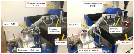 Robotic arm with Arm I—AdM and Arm I—CvM (Figure 8) are shown for NcM at maximum reach. For this method of measurement, the base frame of the 3D measuring machine was used only to fix the position of the robotic arm while maintaining a constant position of the base frame of the robotic arm. At the same time, the base frame of the 3D measuring machine was used to place and fix the proximity sensor holder.