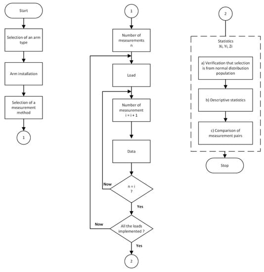Statistical evaluation of measurement results was performed for both Arm I—AdM and Arm I—CvM with the use of CoM and NcM. In each case, 11 measurements described in chapter 2.5 were performed, while each group of 11 measurements formed one set. The results were processed according to Figure 9 as follows: