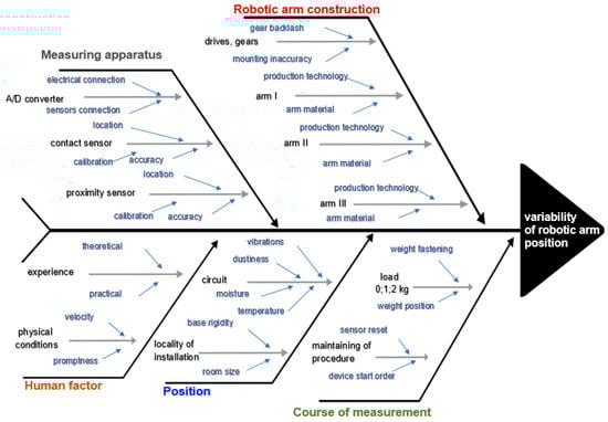 The generated Ishikawa diagram (Figure 10) defines, investigates and detects the effects of several influences and causes, which result in the variability of the robotic arm position. The expected sources of variability in deviations of the robotic arm position that affect it are: