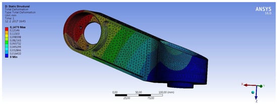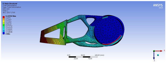 Then, the calculation of robotic arm load was performed using FEM, and the magnitude of the deformation was determined. An example of the result of the calculation is shown in Figure 11.
