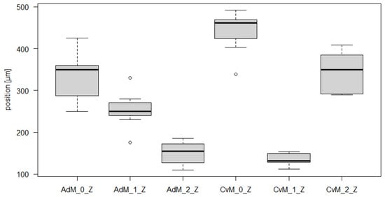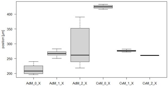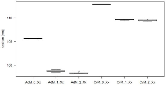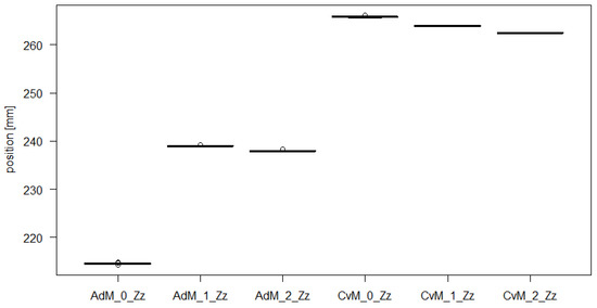 Table 9 shows the results of the F test and the t-test for CoM. It is clear from Table 9 that no match of the mean values is confirmed for any pair. In four cases, for the CoM_0_Zz, CoM_1_Zz, CoM_2_Xx and CoM_2_Yy modes, the agreement of the variances is confirmed.