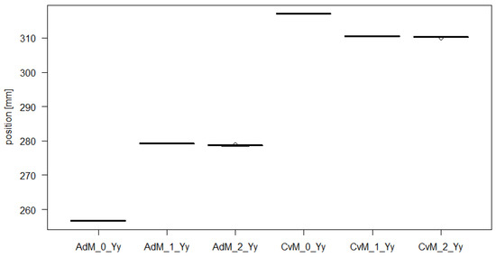 From Table 8 and Figure 17, for Arm I—AdM, measurements in the Y axis direction, an increase in the median value can be observed as the load increases and the range and standard deviation sd change slightly. For Arm I—CvM in the direction of the Y axis, it is possible to observe an increase in the median and the mean with increasing load, while the range and standard deviation sd is higher at higher loads. Failure to meet the condition of normal distribution of measured values is also confirmed by anomalies in Figure 17, at the same time, the stress caused by the construction of Arm I—AdM needs to be considered.