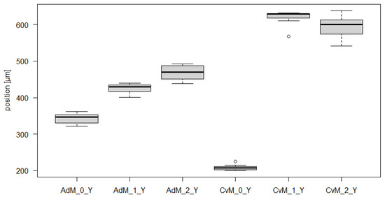 Presented results indicate a statistical significance of differences in positions of the robotic arm endpoint for Arm I—AdM and Arm I—CvM, in position and variability. Since values in the table and the graph are in micrometers, these differences are negligible from a practical point of view. For further investigation, it would be appropriate to plan experimental measurements to better examine whether the differences are random or caused by a factor that has not yet been considered. This was affected by: arm flexibility, loading time, movement time of the robotic arm, sensitivity of the proximity sensor and rigidity of the sensor holder.