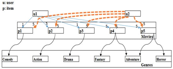 According to research [], user preferences are not fixed and indicate constant fluctuations in their preferences for items. Hence, it is not easy to find a similarity method that matches all user behaviors. The user similarity measure based on the item genre is not widely explored in RSs. Furthermore, traditional similarity measures do not make accurate recommendations for new users or items, and they are less effective with sparse datasets [,]. Initially, a precise similarity measure can be configured between users depending on a user’s preferences for an item’s genre. Basing on movie lens [] and Yahoo Music datasets, our research experiments looked at user preference for movie/music genres. Some movies have multiple genres (see Figure 1); two users, u1 and u2, are highly similar in terms of their choices and ratings of action, fantasy, adventure, and horror. At the same time, they are different in their choices in terms of comedy and drama movie genres. This is, consequently, related to their personalities.