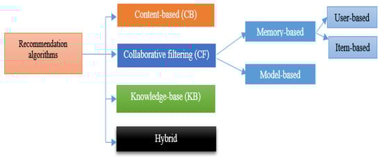 Based on earlier studies, RSs can be classified into the following types []: collaborative filtering (CF), content-based filtering (CB), demographic filtering (DF), knowledge-based filtering (KB), and hybrid. The most common methods for recommending items to users are based on CF []. Typically, CF algorithms are categorized into user-based and item-based models []. In the user-based CF algorithm, recommender systems collect similar users into groups and recommend highly-rated items to similar users []. On the other hand, in the item-based CF system, the similarity between objects is determined based on the items’ ratings. Then, groups of similar items can be created. Finally, if a user rated a specific item highly, similar items might be recommended [].