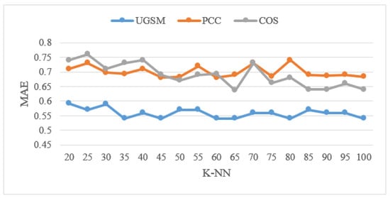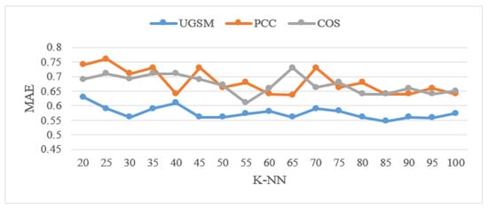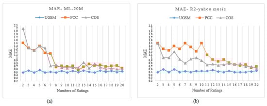 According to [], the accuracy and quality of recommender systems decrease when entity information is insufficient. To check UGSM accuracy, we checked artificial users by establishing UGSM to handle only a few ratings from the datasets. Similar to the work in [], we used a number of ratings, from 2 to 20. Then, we employed UGSM, PCC, and COS similarity measures to produce the predicted ratings; after that, we evaluated the results using MAE. Due to the long execution time, we randomly selected 100 users from each dataset to perform this experiment. Figure 9a,b shows the MAE for different methods outlined for a different number of ratings on ML-20M and R2-Yahoo music datasets, respectively.