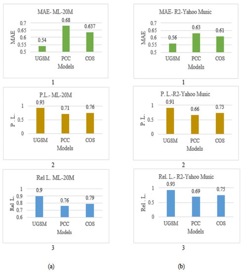 From the results in Figure 6, it is clear that the UGSM exceeds traditional similarity measures in both datasets since it produced an exceptional accuracy according to all tested evaluation metrics. When the k was the optimal value in all models, UGSM’s accuracy was significantly better than PCC and COS. Firstly, in Figure 6a (1) the results confirmed that UGSM decreased the MAE to 14.0% against PCC and 10.0% against COS for the ML-20M dataset. Secondly, Figure 6a (2) showed the P.L. of UGSM—22.0% and 17.0% better than PCC and COS, respectively. Finally, Figure 6a (3), by applying the Rel L metric, showed results and confirmed UGSM’s progress. It increased the Rel L between users by 14.0% and 11.0 % for PCC and COS. The same progress was obtained for the R2-yahoo music dataset.