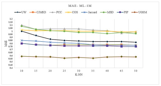 In the third part, we compared UGSM to the proposed algorithm in [], the UW algorithm, which has been compared to a variety of other approaches, including MSD, COS, Jaccard, PIP, and CJMSD []. It was applied in experiments to the ML-1M dataset. Thus, we used their dataset methodology with UGSM to compare them. Figure 8 demonstrates the MAE values for the ML-1M dataset for UGSM and several methods; k from 10 to 50, with increments of 5 per step.