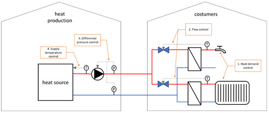 - Control—as a material flow process, a large portion of DH systems rely on improving control mechanisms at various points in the value chain. Optimal control comes down to the determination of the best control signals for the four levels of control in DH networks [11], as shown in Figure 1. Inadequate incentives and control strategies often result in wasteful energy supply margins.