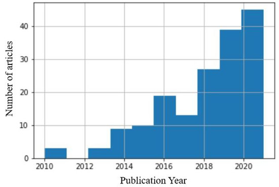 Figure 3. Number of published articles addressing "Machine Learning and District Heating" over the last 10 years (2010–2021).Initially, 1000 articles were selected. These were pre-screened by reading through the title and in some cases the abstract of each article when the title was unclear. We cross-validated against each others perception to minimise the selection bias. The result was a selection of 179 relevant articles. By relying on a meta-search resource such as Harzing’s Publish or Perish, the most relevant research articles could be indexed from a variety of databases. The search was limited to “Machine Learning and District Heating” because the authors came to the conclusion that no relevant article will exclude such keywords even if some may also include Artificial Intelligence. - An analysis of existing knowledge to determine the extent to which various DH relevant problems have been addressed by ML research.Other literature reviews were analysed to determine whether they provided enough of an overview of how ML has been applied in the field of DH. However, we perceived that the identified review studies left room for focusing on the discrepancies between relevant industrial challenges in DH and the state-of-the-art applications of ML. Still, they were invaluable in shaping our understanding of the current state-of-the-art in ML applications and district heating. Relevant information was extracted from the selected articles in a way that allowed for identification of major themes in terms of the problem area addressed. We make use of relevant review articles together with our own experiences, when determining how different DH problems have been addressed by existing ML research.