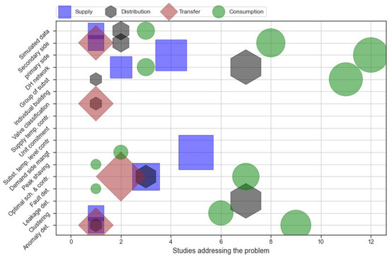 Among the papers we have reviewed, the vast majority focused on forecasting energy demand. More specifically, among the 179 articles we studied, 137 addressed a concrete DH challenge, most commonly proposing new ML solutions (the rest consisted primarily of surveys and position papers, or papers outside the scope of this discussion). A stunning 98 of them considered forecasting to be this challenge, making it 72% of the field. The second most popular category was anomaly detection, with only 9 papers. In the spirit of focusing on gaps rather than the obvious, we will not discuss forecasting further here, especially given that—as indicated above—several reviews of DH forecasting have already been published. Instead, we will focus on more unique papers addressing the less popular areas, since we believe they deserve increased visibility. Thus, Figure 4 offers a clearer picture that would have been difficult to observe if forecasting studies were included. In Figure 4, the studies have been categorised according to the DH value chain, with the size of each bubble suggesting the extent to which the problem has been addressed for the given category.