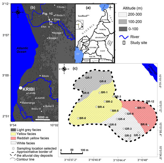 - Ndjigui, P.-D.; Onana, V.L.; Sababa, E.; Bayiga, E.C. Mineralogy and geochemistry of the Lokoundje alluvial clays from the Kribi deposits, Cameroon Atlantic coast: Implications for their origin and depositional environment. J. Afri. Earth Sci. 2018, 143, 102–117. [Google Scholar] [CrossRef]