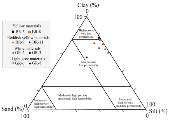 Plotting of alluvial Lokoundje clays in the clay–sand–silt diagram.