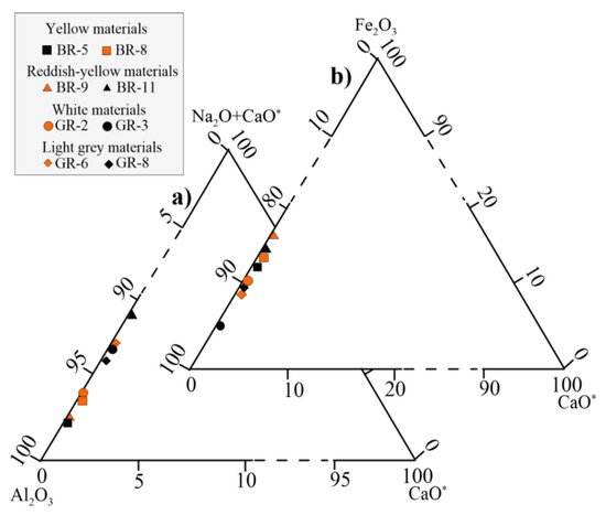 Plotting of the Lokoundje alluvial clays in Al2O3-CaO-(Na2O + K2O) (a) and Al2O3-CaO-Fe2O3 (b).