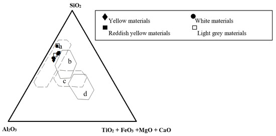 The chemical data showed that SiO2 and Al2O3 are the most abundant oxides (SiO2 + Al2O3 > 75 wt.%). The SiO2/Al2O3 is less than 2 in several samples (Table 2) and is an indication of a predominance of kaolinite associated to quartz. The Lokoundje alluvial clays are mainly aluminous with Al2O3 contents varying between 23.29 to 30.26 wt.% (Table 2; Figure 3). These sediments are also characterized by low contents in Fe2O3t which vary between 1 and 5.42 wt.% (Table 2). These contents are less than 3 wt.% in white and light grey materials (Table 2). The color of the products after sintering is due to the iron contents (Table 2). The white samples are characterized by lowest iron contents, and the color of products remains the same after sintering (Table 2). The flux oxides (Na2O + K2O) are very low (1.08–2.50 wt.%), these low flux contents may induce poor vitrification. Fluxes, in reaction with silica and alumina, stimulate liquid phase formations that facilitate densification [24]. The low Na2O and K2O contents can be related to the absence of Na-/K-feldspars. In addition, due to low flux contents, a high firing temperature for improved sintering may be needed. Figure 4 shows that these alluvial clays are suitable for the manufacture of white stoneware tiles.