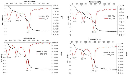 The thermal analyses (TGA-DTG) measurements are reported in Figure 5. The thermal analyses show three mass losses: the first loss occurs around 60–66 °C and corresponds to the loss of adsorbed water [25,26,27]. The second mass loss at 241–252 °C is associated with the conversion of goethite into hematite, and the last one at 489–492 °C is related to the dehydroxylation of kaolinite [28]. The goethite to hematite conversions confirm that iron is mainly present in form of goethite and that this will probably lead to a reddish color in the fired sample. The variation in the temperature of the last mass loss (489–492 °C) is associated with the crystallinity difference of the kaolinite [25]. As previously reported, FTIR revealed that kaolinite has a high degree of disorder, characteristic of several alluvial environments [18,29]. The intensity of the dehydroxylation peaks (489–492 °C) is coherent with kaolinite-rich materials and the associated mass loss varied between 14% and 18%; these values are consistent with the theoretical weight loss from the kaolinite ideal formula of 14%.