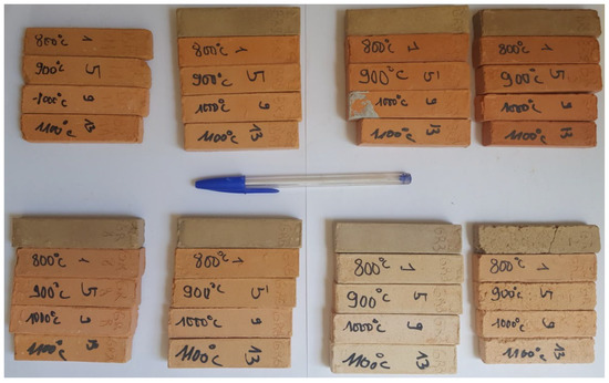 For making the test briquettes, humidified powders were pressed to form prismatic bars, which were heated to 800, 900, 1000, and 1100 °C. The firing temperatures were chosen within the classical temperatures for fired clay bricks. The specimen dimensions were 40 mm × 20 mm × 20 mm. The colors of fired products were determined using the Munsell’s Color Chart. The specimens were elaborated as briquettes, given that mechanical behaviors are accessed through flexural strength in a three-point bending mode. The physical and mechanical properties were determined at each sintering temperature using the elaborated briquette.