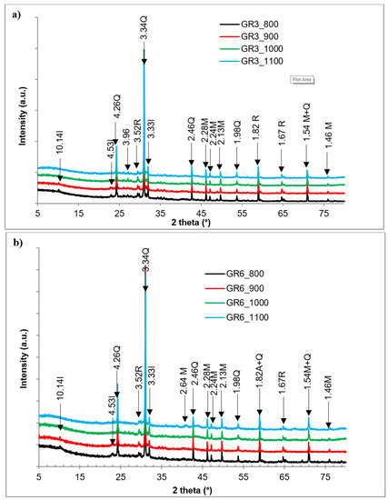X-ray patterns of the clay sintered at different temperatures: (a) GR3 sample; (b) GR6 sample; I: illite; Q: quartz; M: mullite; R: rutile; He: hematite.