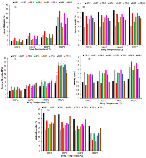 The flexural strength increases with the firing temperature because of an increase in densification (Figure 8c). This densification is supported by the XRD patterns, in which an increase in mullite formation with temperature is noticeable. The highest value obtained was 15.75 MPa for sample BR5 fired at 1100 °C. For all other samples, the highest value of flexural strength was reached at 1100 °C (Figure 8c). This can be explained by the high Al2O3 content [34] and/or the increased formation of a dense phase, such as mullite during sintering [35]. The bulk density (Figure 8d) followed the same trend as the flexural strength, which was consistent with the proposed increase in density upon firing, because of dense phase formation. Between 800 and 1000 °C, the bulk density is almost constant. This may be due to the similar mineralogical composition of the samples, in which the main dense phases are quartz and a primary mullite from 1000 °C (Figure 7). The density of the BR5 sample was also the highest among the series. Given that its clay size fraction, from particle size analyses, was the highest (76%) for the GR2 sample, then the mullite formation from sintering was higher in these samples compared to others. The difference reached in the flexural strength was probably due to crystallinity differences, which may affect the kinetics of mullite formation.
