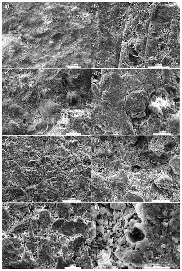 The decrease in the water absorption (Figure 8e) is in agreement with the change in the flexural strength and the bulk density as a result of improved sintering. These values were considerably reduced to less than 20% at 1100 °C, except for in two samples (GR-2 and BR-11), probably because of a glassy phase formation that diffuses between the grains, causing pore enclosure. The water absorption was less than 25%, indicating that these clayey materials can be of use for tile manufacturing. At 800 °C, the sintering was not sufficient to improve densification, which explains the high level of water adsorption.