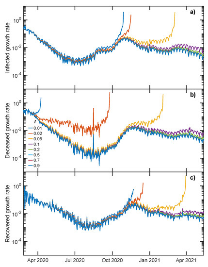 (a) Infected, (b) deceased and (c) recovered growth rate (see Equation (5) for definition) vs. t (days) in a log-lin plot for different values of herd immunity ratio: 0.01, 0.02, 0.05, 0.1, 0.2, 0.5, 0.7, 0.9. While shows a clear divergence for , it does not change significantly for .