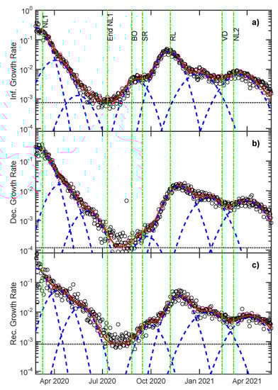 (a) Infected, (b) deceased and (c) recovered growth rate fitted by a Gaussian mixture (Equation (18)) with seven components (blue dashed lines) plus a constant background (black dotted line). The red solid line corresponds to the total fit and the vertical green dashed lines mark important dates as described in the text.