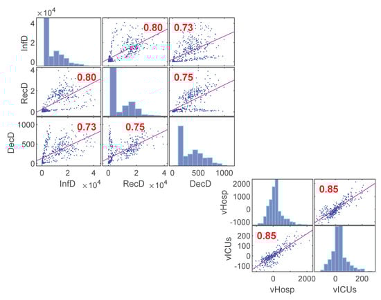 A statistical analysis was carried out with the aim to find specific correlations between raw data corresponding to daily new counts for infected, deceased and recovered people and daily variations of hospitalized and admitted to intensive care (ICUs). Figure 3 reports the correlation matrix of these variables.