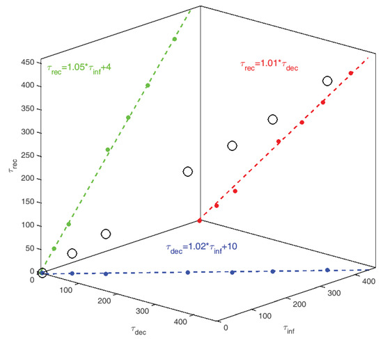 Spearman’s rank correlation coefficient was used to ascertain the strength and direction of the relationship between two variables (off-diagonal plots in Figure 3). This statistical analysis was again performed using MATLAB and red values correspond to a statistically significant level with . It emerges that the daily number of deceased and recovered people shows a strong positive correlation with that of the infected people of 0.80 and 0.73, respectively. This trivially confirms that both deceased and recovered people increase with infected. Moreover, we observe a corresponding strong positive correlation of 0.75 between the number of daily deceased and recovered people and, an even stronger positive correlation of 0.85 (easily understandable) between daily variations of hospitalized and ICUs. Unfortunately, the exact mechanisms underlying this association are uncertain since several possible reasons may determine these trends. However, in order to at least find a correlation between the time of the events considered crucial and the change in the growth rate of infected, deceased and recovered people, we analyze the centroids values with respect to each other. The tridimensional graph, plotted in Figure 4, shows how peak centroids for all three growth rates are linearly dependent with an average offset of 10 days between infected and deceased peaks and 4 days between recovered and infected peaks. These values correspond to the above mentioned average lag between the growth rate of recovered and deceased people with respect to that of infected people. Unsurprisingly, the obtained angular coefficients of the straight lines vary in a range of values very close to 1. This confirms our previous observation of a correspondence between infected growth rate peaks and deceased or recovered growth rate peaks shifted forward in time.