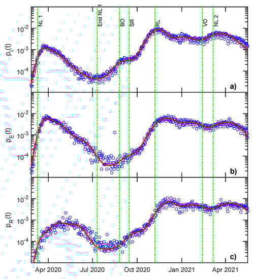 (a) Infected, (b) deceased and (c) recovered probability distribution functions. Blue open circles correspond to raw data, while the red solid lines represent model curves (Equations (26)–(28)).